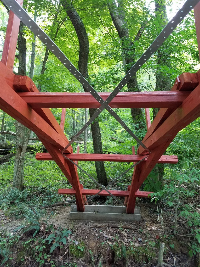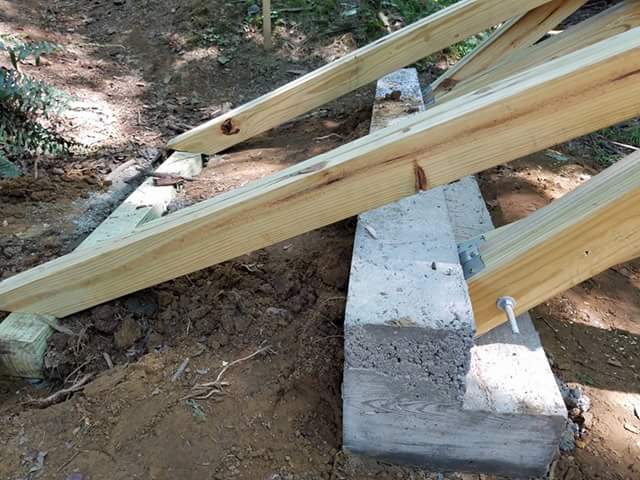 While a lot of the work and pre-assembly took place in the workshop, foundations had to be dug and poured and the arches moved into place over the creek. Getting the foundations parallel and aligned across the creek without a laser was also challenging, Fortunately, John is experienced with concrete work and took the lead in setting the foundations. When all was done the two foundations were in near perfect alignment. I was convinced they were not aligned but in the shape of a parallelogram, but I was wrong.