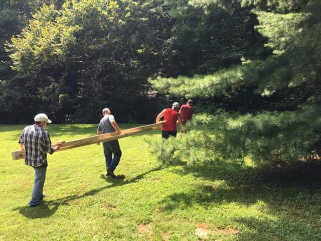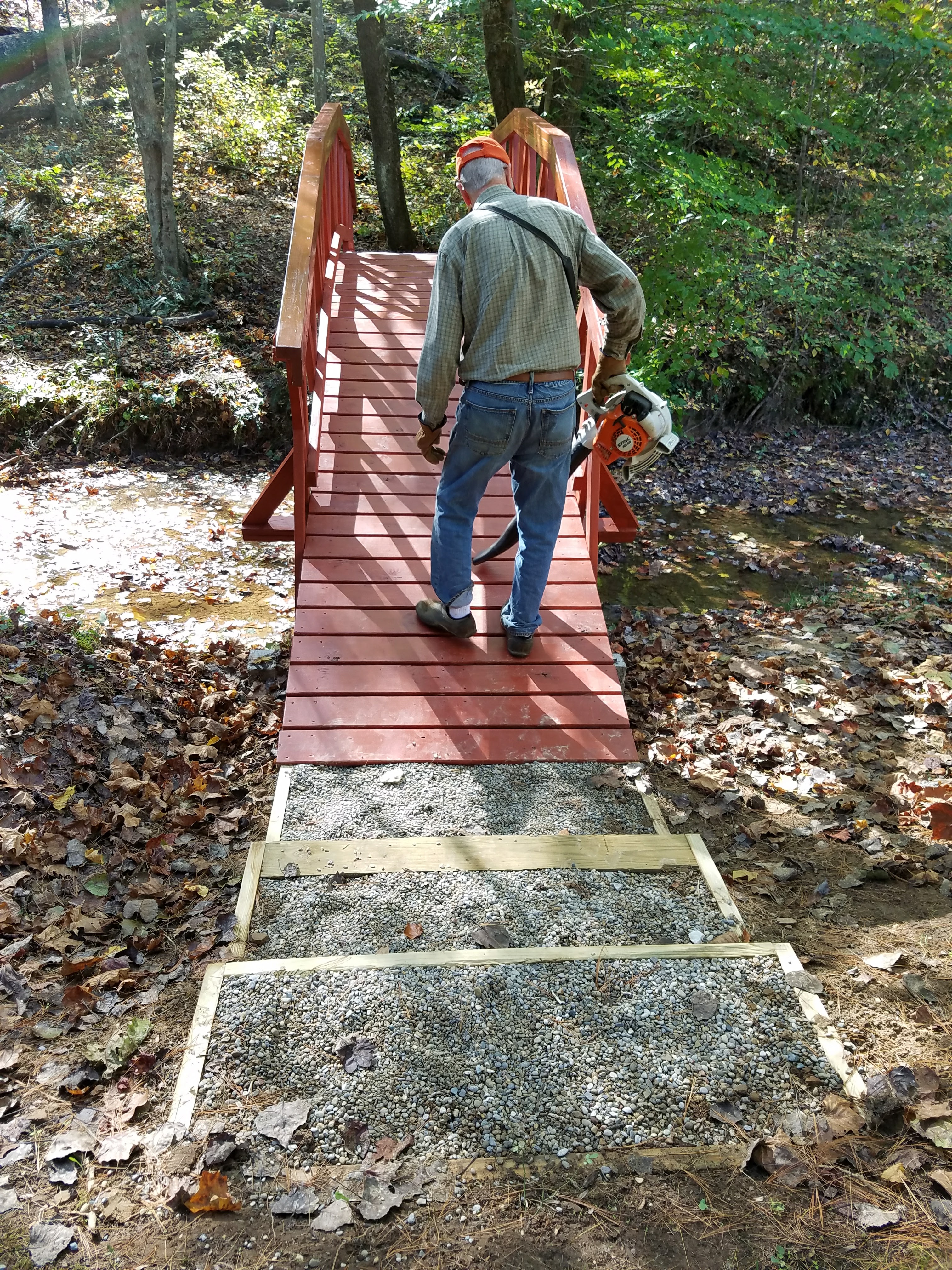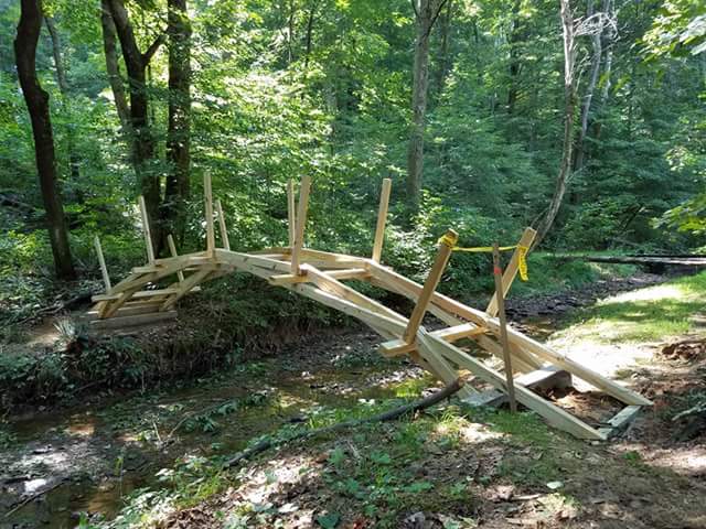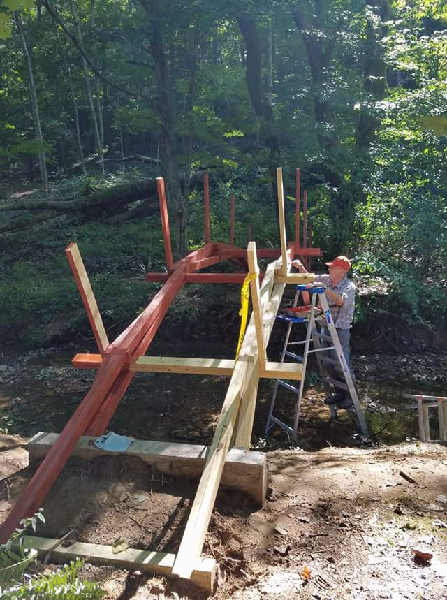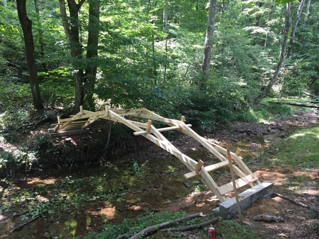 This past summer Operations Manager John and I needed a new construction project, and Marsh Hollow needed a new footbridge over the creek. After considering a truss and a suspension bridge, I stumbled on a modified truss (“rainbow bridge”) designed by Frank Petersohn of Vancouver BC. Although Frank has passed away, his son Michael now sells the very reasonably priced bridge plans, but fully cut and drilled kits are no longer available. For more information about constructing this type of bridge, please visit The Rainbow Bridge.