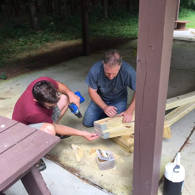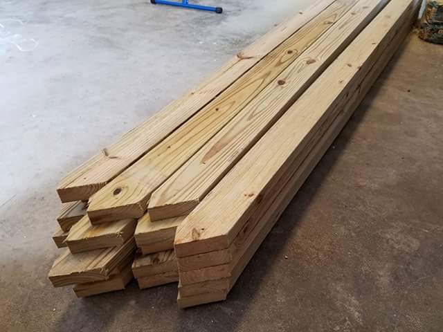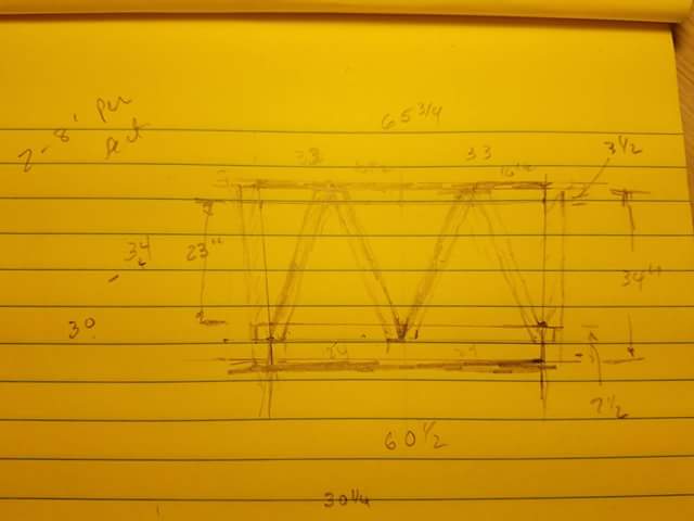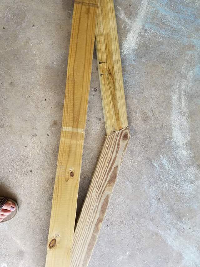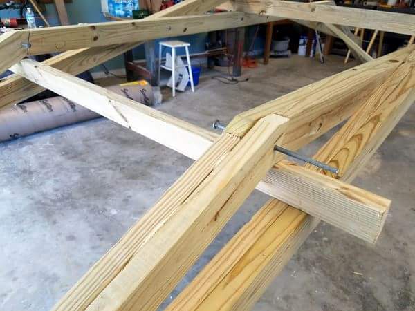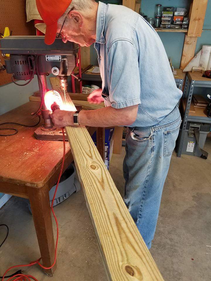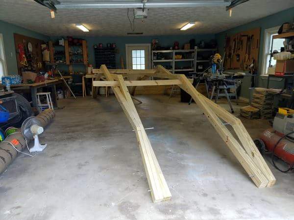 Cutting and fabricating the arches, which are cut from stock 2X4’s, required angle cuts such as 18.4° and measurements such as 123 23/32”. To say the least these are challenges on a chop saw. It wasn’t until we were nearly done that I got a digital angle measurement tool (should have had it from the beginning). Fortunately, I had Mary check and challenge my measurements (she was always correct). She also held many of the longer pieces being cut.