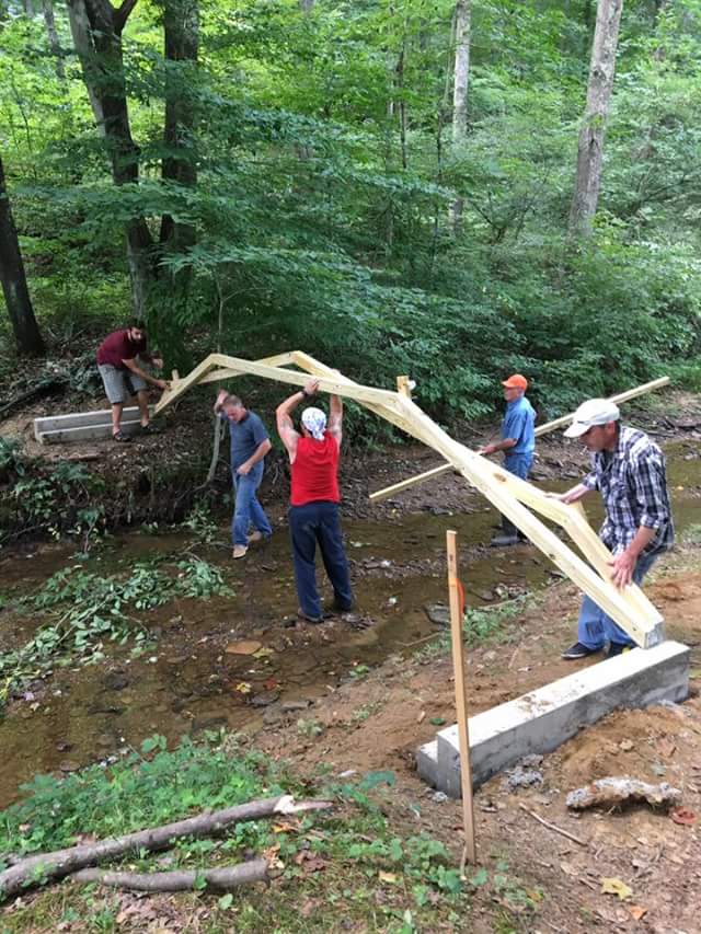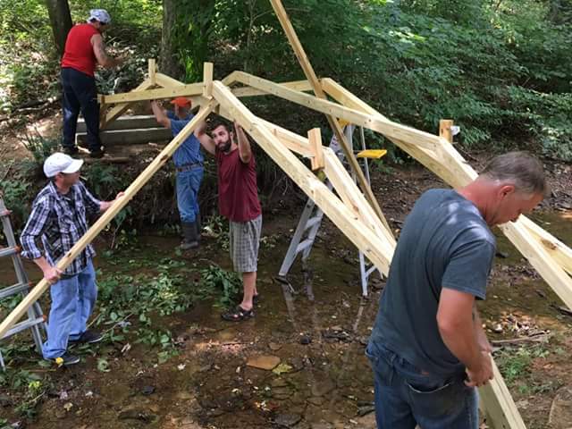 After footers were in place, the arches were moved from the workshop to a shelter on our property closer to the bridge site.