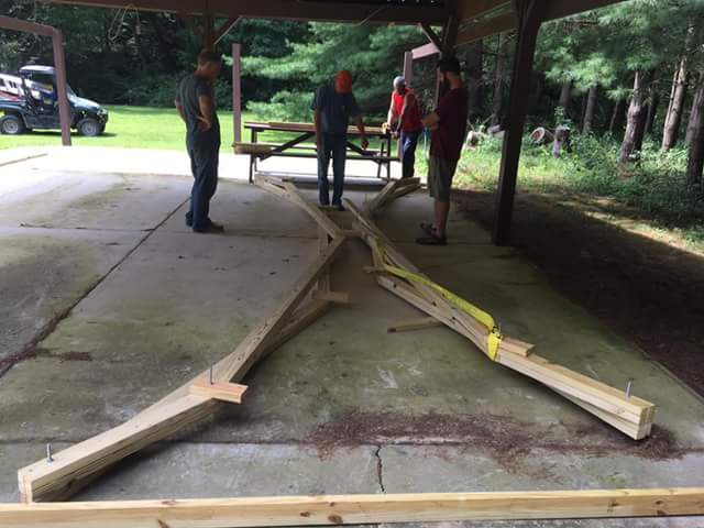 The footbridge arches standing upright in our workshop. This is one of the peaks with a test fit of the cross beam pieces. Temporary bolts in place.