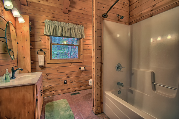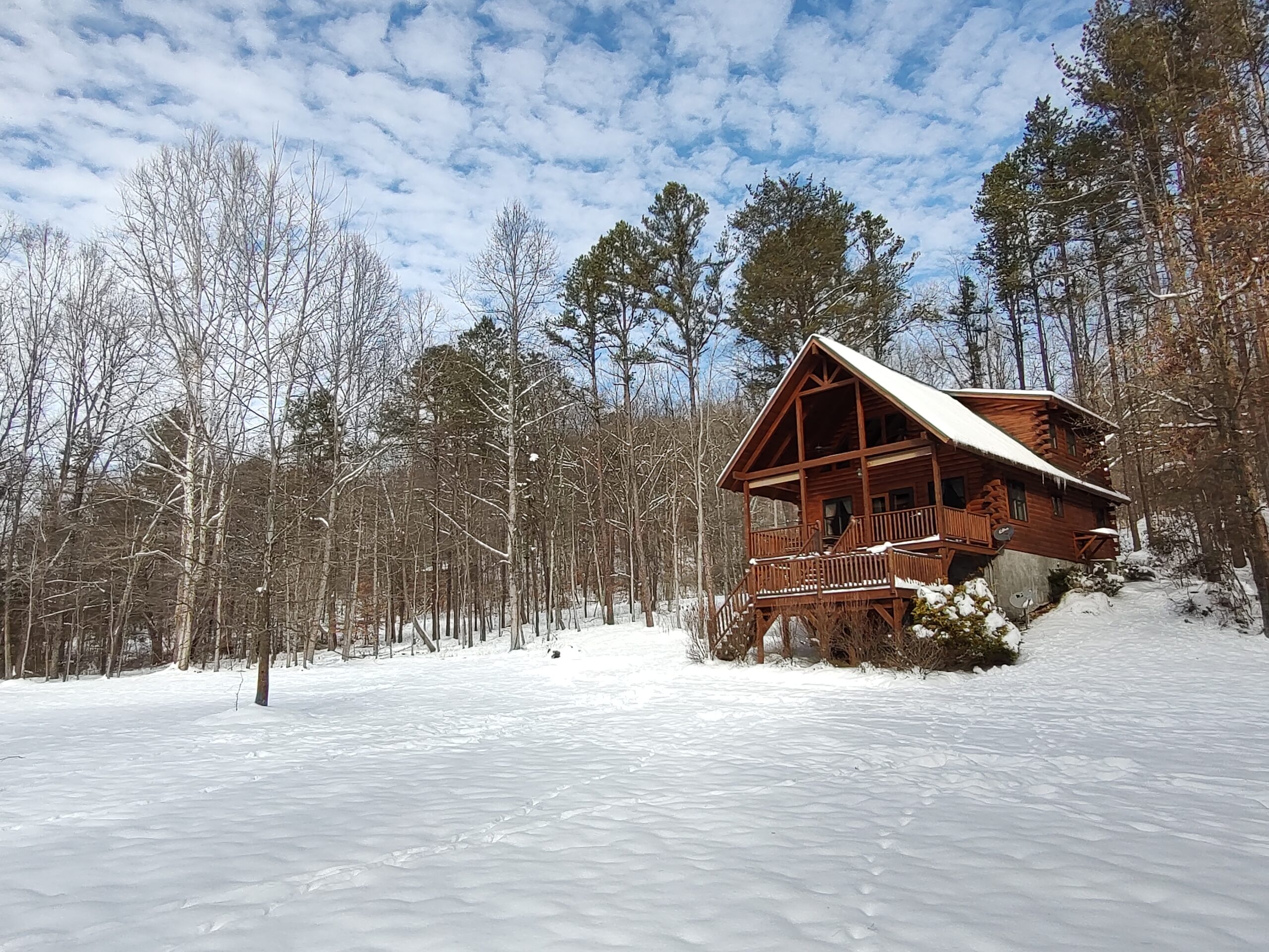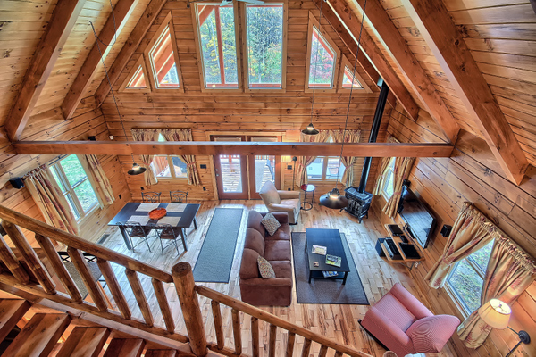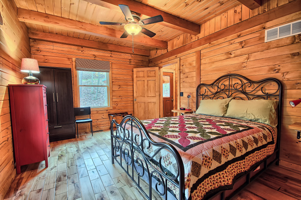Shadyside Cabin features two bedrooms one on the first floor with a queen-size bed; one on the second floor with a queen size bed and a full size futon. There are full bathrooms on both floors. Shadyside also has a great room, fully equipped kitchen & large deck. Guests will appreciate our HDTV, & sound system. Perfect for two couples or groups up to six.